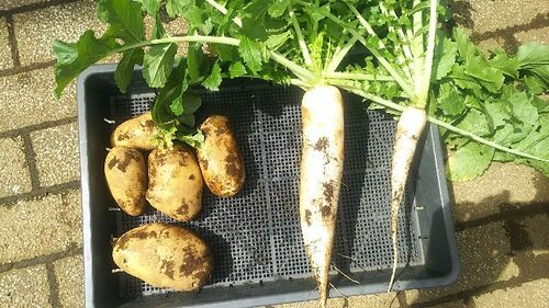 今朝のこと。 雨上がりの様子を見に畑へ。 雑草がスゴいことに… ネットのないアブラナ系はレースのカーテン… まぁ、ここまでは想定の範囲内。 で、じゃがいもの畝を見ると、もう収穫のサインが出ています。 はじっこの一株、マルチをめくり上げてみるとデッ…
