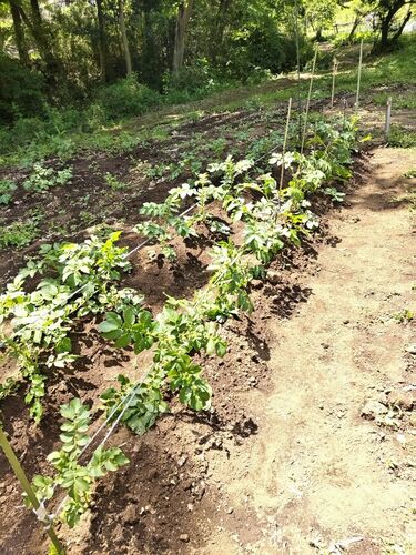 前回、追肥と土寄せをした挿し芽のジャガイモ、尿素の葉面散布が効いたのか? 数日でひとまわり大きくなっていた。 そして、その数日の風でちょっと暴れ気味。 そこで管理が楽になるように、紐で挟んで立たせてみた。 で、更に土寄せ。 株によっては結構な育…