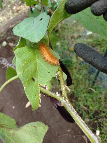 ナスについてました。 「クマケムシ」です。 デカいしフサフサしてて気味が悪いけど、毒性はない虫。 多分… 見たところ一匹だけど、大量に湧いたらチョットねぇ…