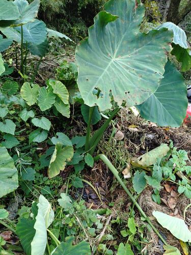 残渣置き場に無数に生えている野良里芋。 ナスの残渣を処分した時に、コイツを何の気なしに引っこ抜くと… まさかのタケノコ芋。 曲がってはいるけど、意外に良いサイズ。 追肥も土寄せも一切していないのに… ちなみに先日掘った、ちゃんと栽培したものと比べ…