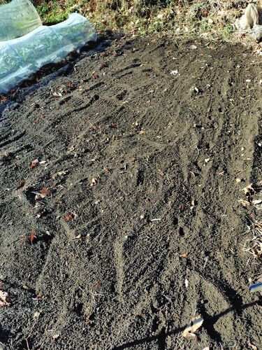 タケノコ芋の跡地。 落葉と残渣堆肥を鋤き込んで雨に当てた後です。 よく見ると、雨待ちの数日間でコレ。 四つ足は、耕すとすぐに現れやがる… さて、しっかり水を吸ったところで、透明マルチを張って地温を上げていきましょう。 冬の間は使わない農具を上に…