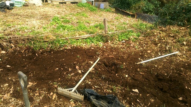 昨年畑に置き忘れていた堆肥を発見したから、ネギの横のスペースに鋤混んで軽く耕した。
