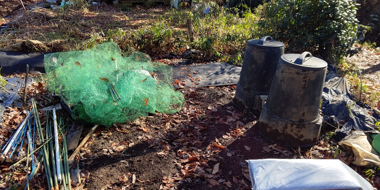 ネットとコンポストの奥、防草シートを張っているところ。