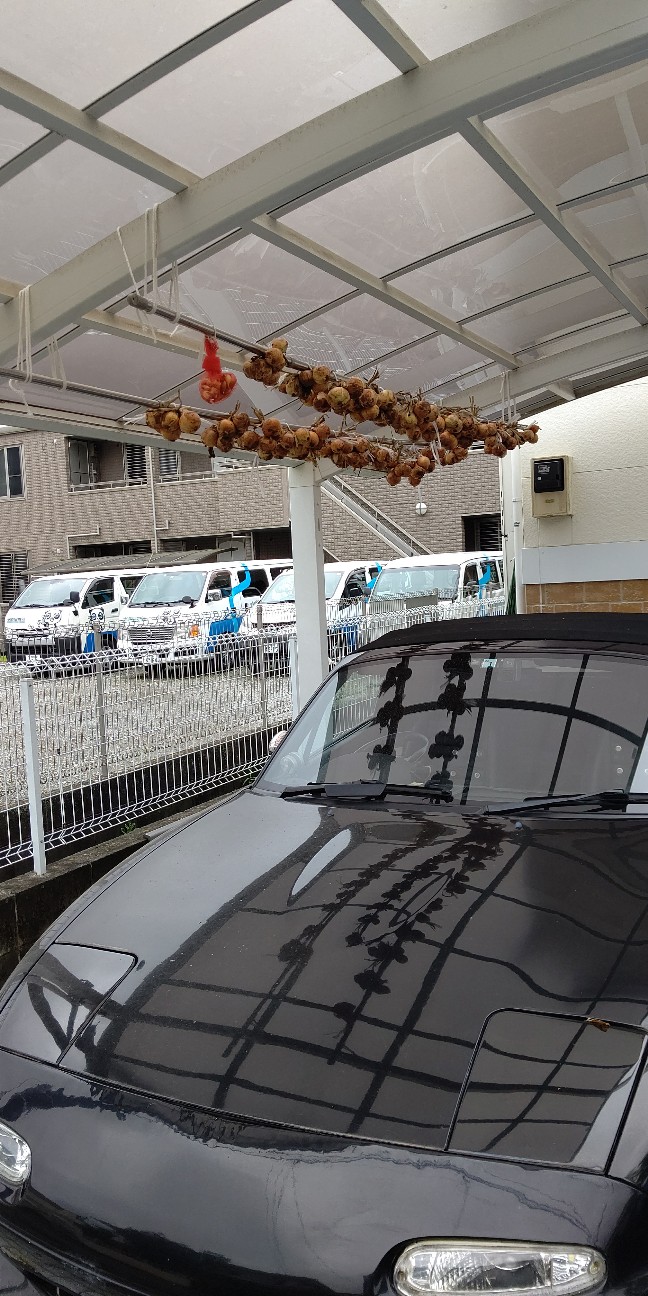2020-06-14 タマネギを吊す 土 食 朝からひとりで頑張った。 落ちても車に被害が出ないように、ボンネットの上は軽めの小玉を配置(笑) 長期保存ができる品種なので、上手くいけば来年3月までこのままでいけます。 が、数も大きさも大したことないので、3ヶ月も保たないだろうね。