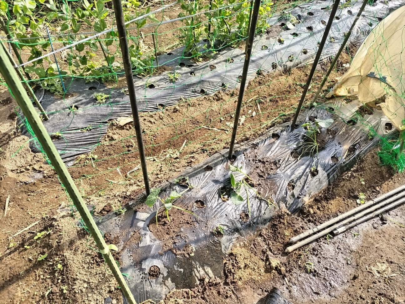育苗中のキュウリ、インゲン苗の植え付けを済ませてきた。